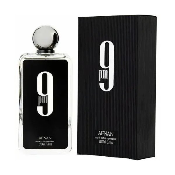 9 PM Eau de Parfum (EDP) by Afnan opens with apple, cinnamon, wild lavender, and bergamot. The heart reveals orange blossom and lily-of-the-valley. The fragrance settles into vanilla, tonka bean, amber, and patchouli.